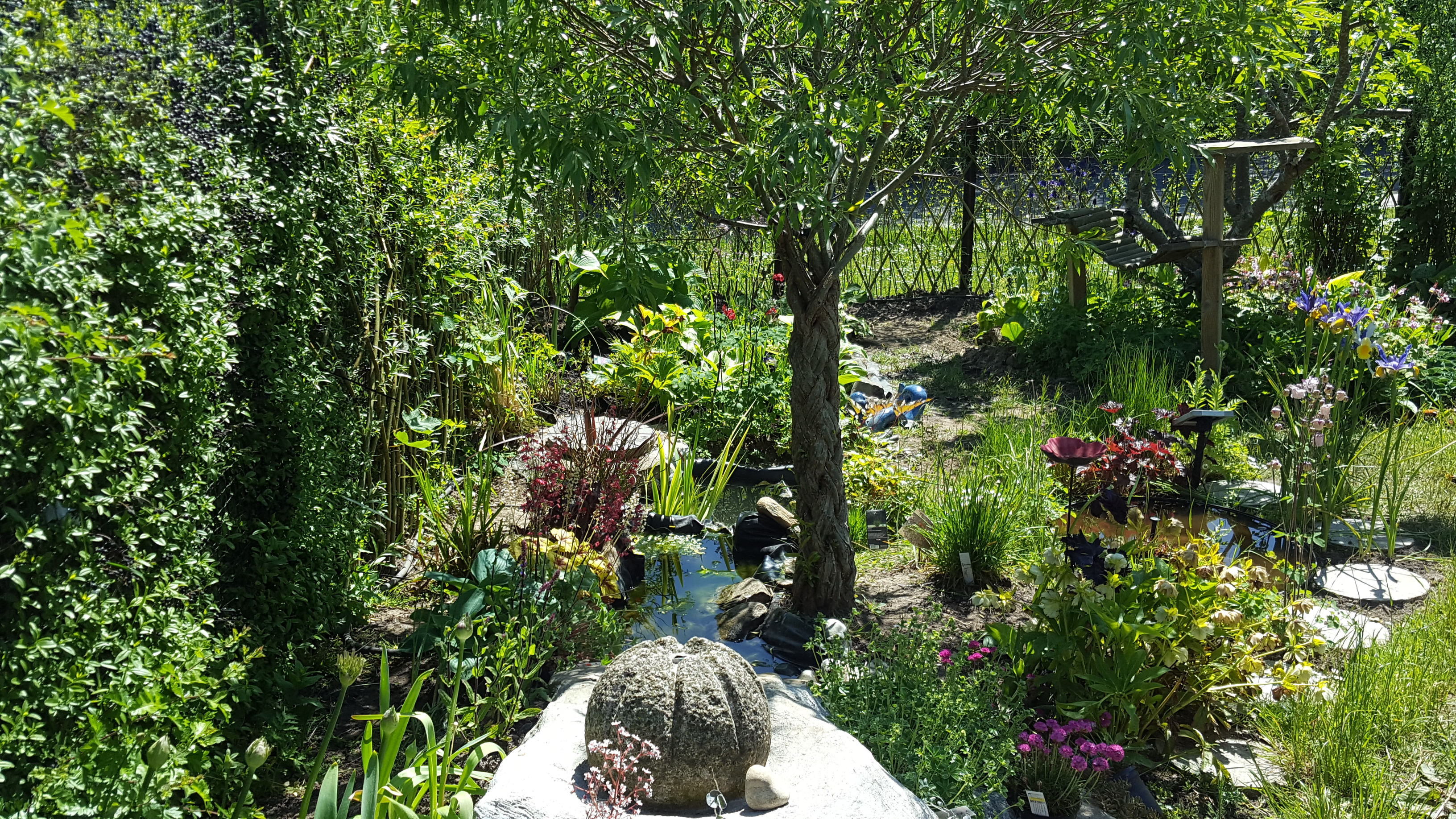 Høhøh, jeg skal vist tage lidt billeder af vores have til dig så. Der er på den ene side et bed med hindbær og lidt stokroser, en balje (ala højbed) med krydderurter og salat, et bed med en ribes, diverse bunddække som hostaer mv. (og en lygtepæl), på siden ud modsat huset er der to klematis op af hegnet. På den anden side er der et bed i hele havens “dybde” med roser, jordbær, rabarber, krydderurter og en stor lavendel. Langs halvdelen af havens bredde er der op af huset et bed med roser, en hortensia, liljer og en purpursolhat. Så er der en kapilærkasse til tomater, en lille vogn/reol (de der metal fra IKEA på hjul), men haveting. Og så selvfølgelig udover græsplænen en terrasse med et rundt havebord og et par stole, samt et par krukker med blomster og krydderurter